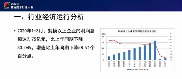 會議現(xiàn)場,中國建筑防水協(xié)會秘書長朱冬青作出了《后疫情時期防水行業(yè)的挑戰(zhàn)和機遇》的主題演講,他從防水行業(yè)經(jīng)濟形勢分析、疫情對行業(yè)的影響分析和行業(yè)發(fā)展的挑戰(zhàn)與機遇三方面對主題演講進行了解讀。